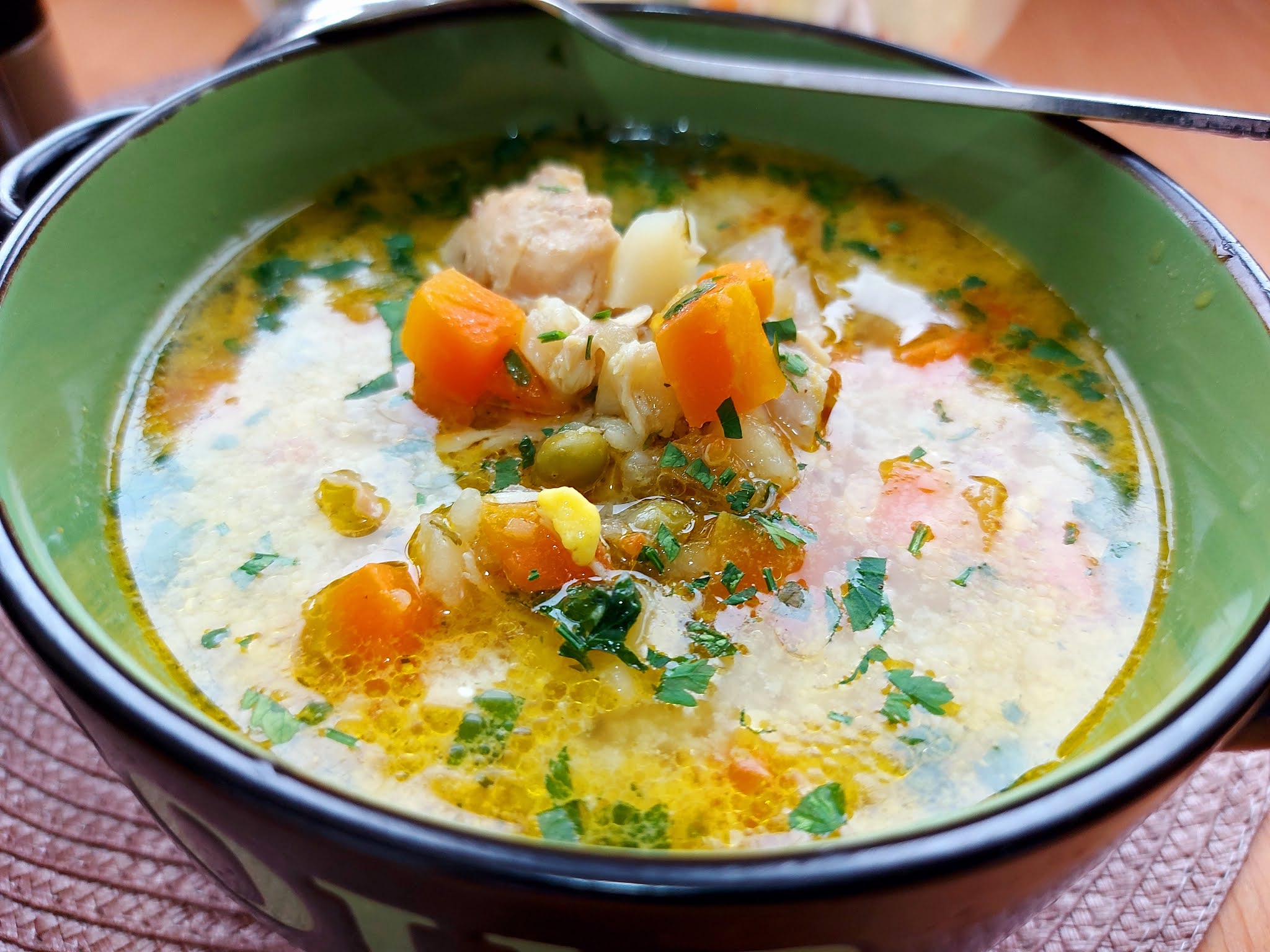 600 gr pilećeg mesa2 šargarepe1 glavica crnog luka1 koren celera i lišćapašknatbamija ili šaka graškamalo bibera..solilovorov list po želji1 žumance2 kašike kisele pavlake1 kašičica brašnapo želji suvi začinperšunov listmalo ulja