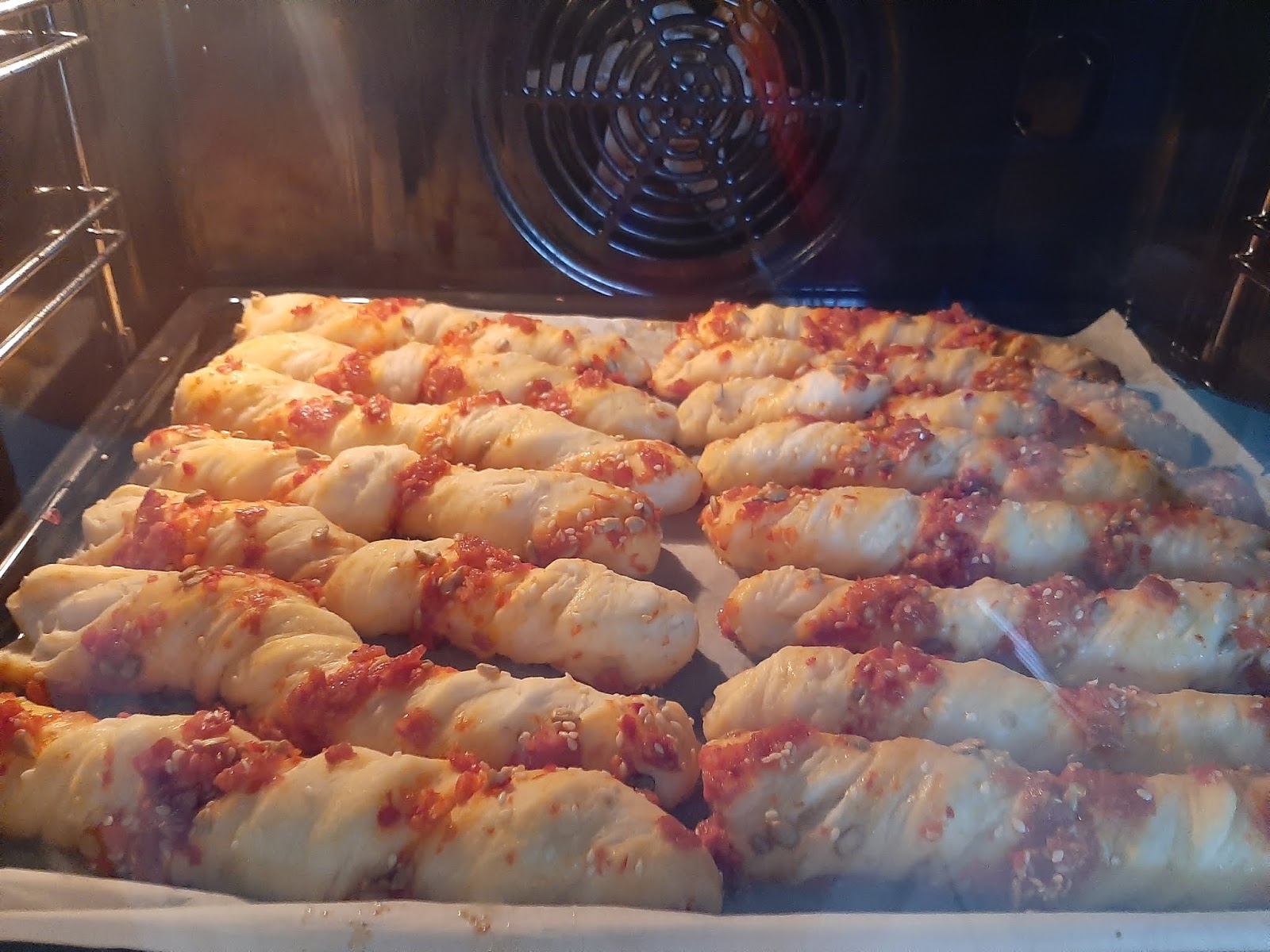 Razviti pola cm. pa premazati ajvarom. Iseći na trake pa posuti seckanim dimljenim kobasicama i semenkama
