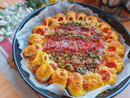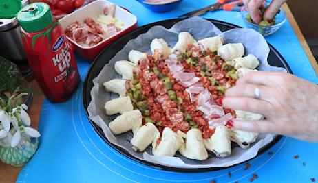 Sredinu premazati kečapom i rasporediti nadev po želji. Paradajz iseći pa ga staviti izmedju svake rolnice.