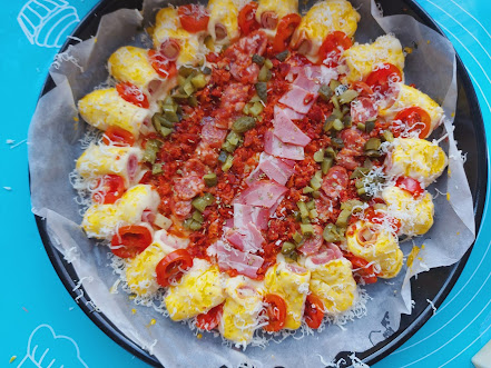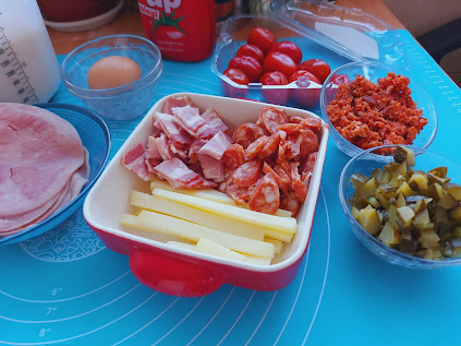 Nadev: kečap100 gr šunke50 gr suve kobasice100 gr suve slanine3 kisela krastavcamalo čeri paradajza50 gr štapiće kačkavalja 1 žumanceoriganomalo kačkavalja