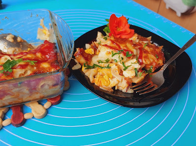 Dodati preko malo kečapa i kuvanih jaja na kolutove Dodati pola rendanog kačkavalja. Istresti ostatak testenine, narendati ostatak kačkavalja i završiti sa kečapom.