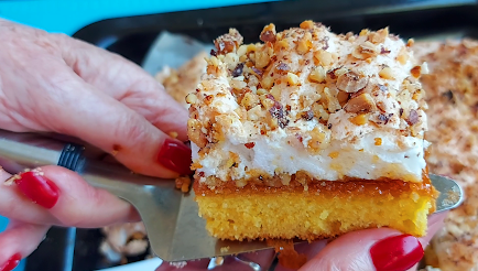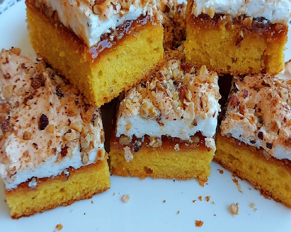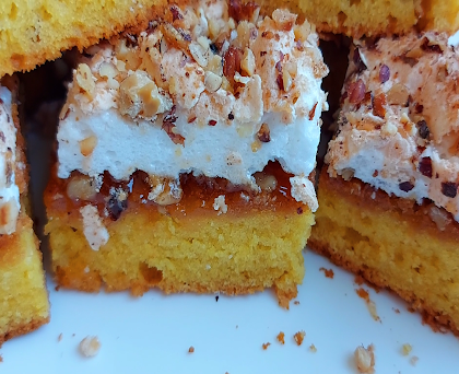 Izvaditi i premazati sa džemom i posuti sa 50 gr seckanih oraha i lešnika. Belabca umutiti sa šećerom dodati 2 kašike limunovog soka. Mutiti 5-6 min. da se dobije cvrst šne,