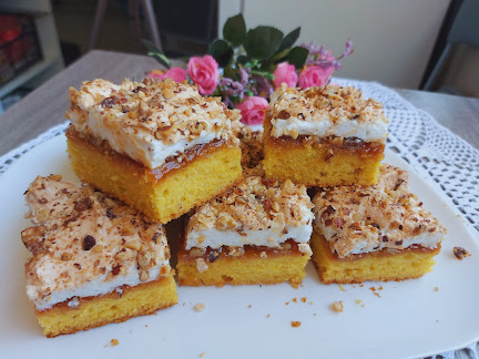 4 jaja4 kašike šećera + 100 gr100 gr maslaca (MOŽE MAST)korica limuna1/2 praška za pecivo100 ml jogurta180 gr brašnasok limuna Namaz:200 gr džema od kajsija100 gr seckanih oraha i lešnika