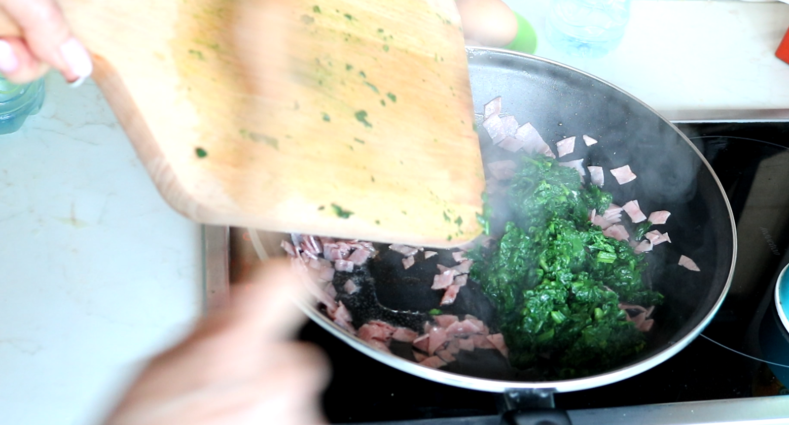 Spanać očistiti i oprati i obariti. Iseći na sitno. Sipati ulja malo pa propržiti šunku pa dodati seckan spanać i malo prodinstati da ispari tečnost.