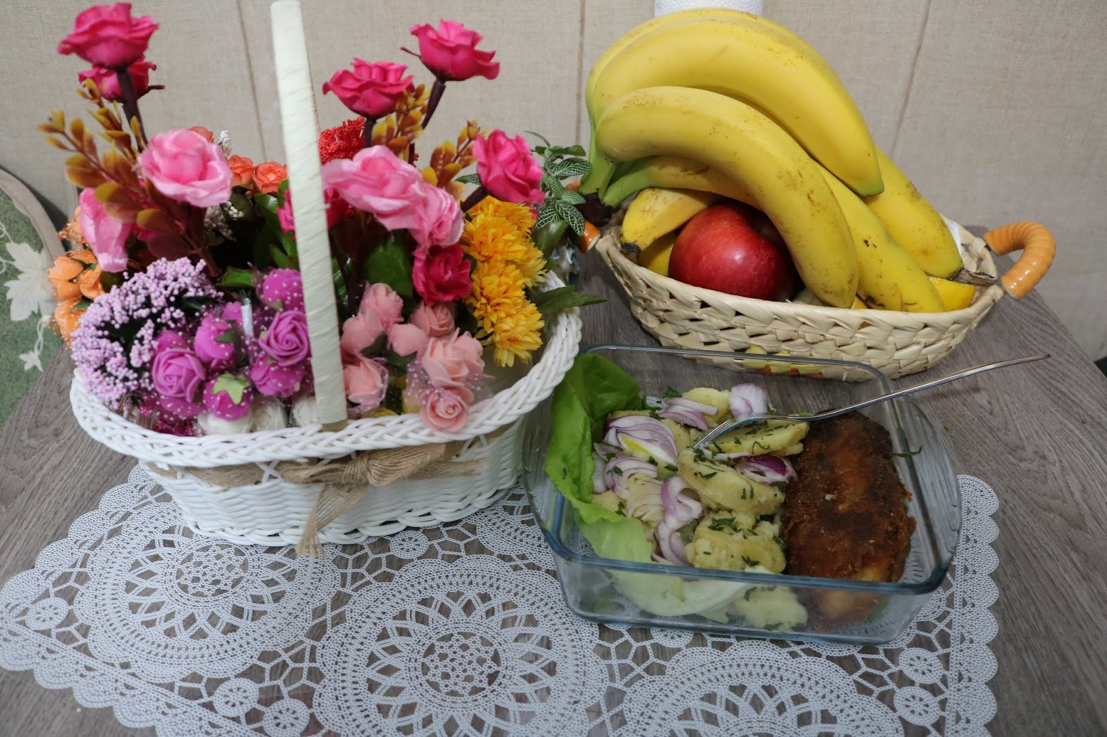Krompir skuvati u ljusci pa oguliti. Iseći na kolutove. Posoliti, pobiberiti dodati seckan crveni luk peršunov list i maslinovo ulje .