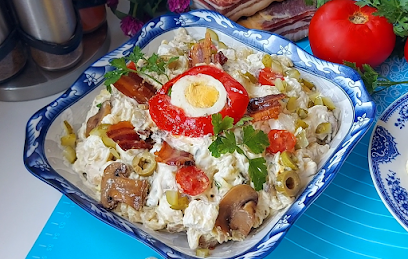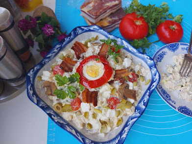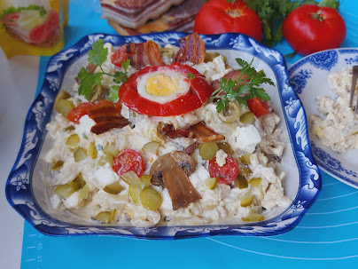 150-200 gr testenine150 gr majoneza200 gr kisele pavlakepileće belo mesosoli..bibeta1 kašičica senfa4 kisela krastavčića2 kuvana jajepo želji listove slanine