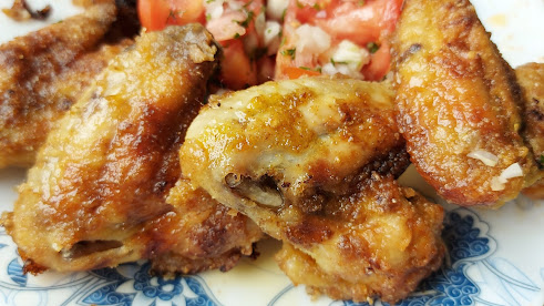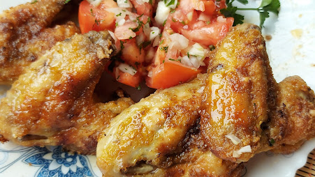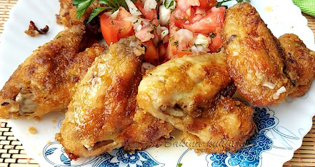 Posoljena krilca provući kroz brašno i ulje sa začinima i redjati u podmazan pleh. peći na 220 stepeni C oko 50 min da lepo porumene. Izvaditi iz masnoće i služiti toplo… Vrhunsko prijatno..