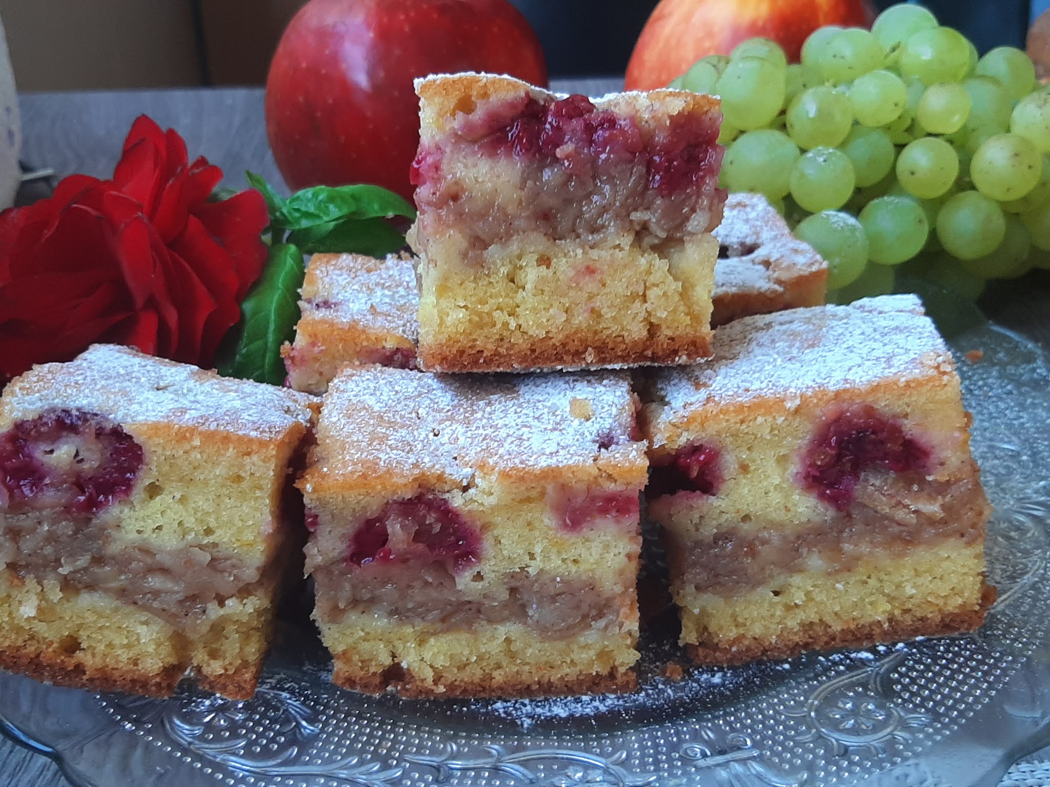 3 jaja400-500 gr jabuka rendanih200 gr malina1 cimetkorica limuna50 ml. ulja100 ml mleka2 kašike šećera za jabuke120 gr maslaca ili margarina60-100 gr šećera u prahu za maslac250 gr brašna1 prašak za pecivo