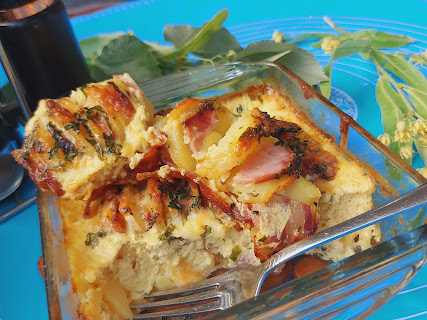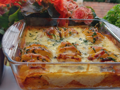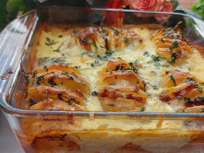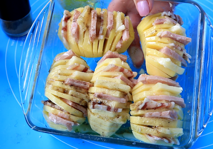 Priprema. Krompir očistiti pa ga zaseći na listiće i izmedju ubaciti listove šunkarice, kačkavalja i suve slanine.