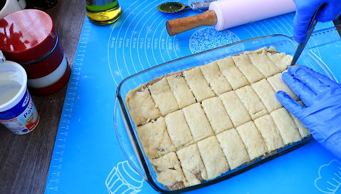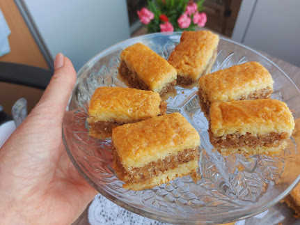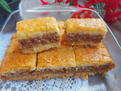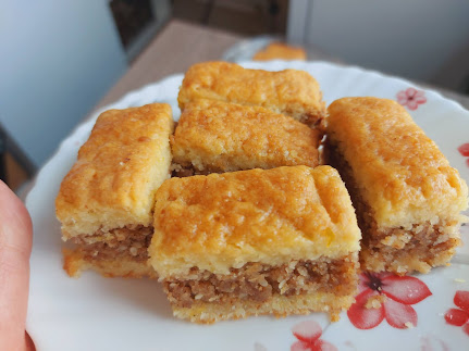 Na foliju razvući veličinu pleha Preko donjeg dela u plehu staviti razvijen nadev od oraha a preko oraha drugi deo razvijenog testa. Poseći nožem na kocke i peći na 190 stepeni 45-50 min. . Pečen ponovo nožem iseći po sečenim delovima..