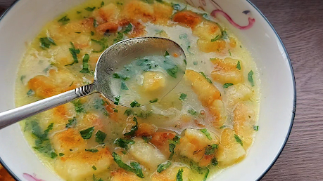 Dodati biber začin list peršuna po želji beli luk u granulama. Sipati u tanjir i dodati kockice hleba (kubeti…krutoni)