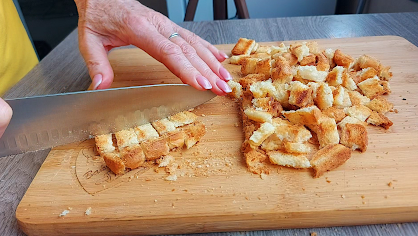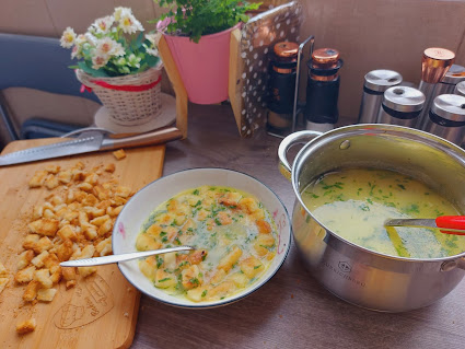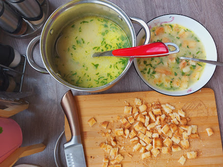 30 ml ulja2 kašike brašnabiberasolisuvi začun po željilist peršunaprepečene kocke hleba (kubeti)
