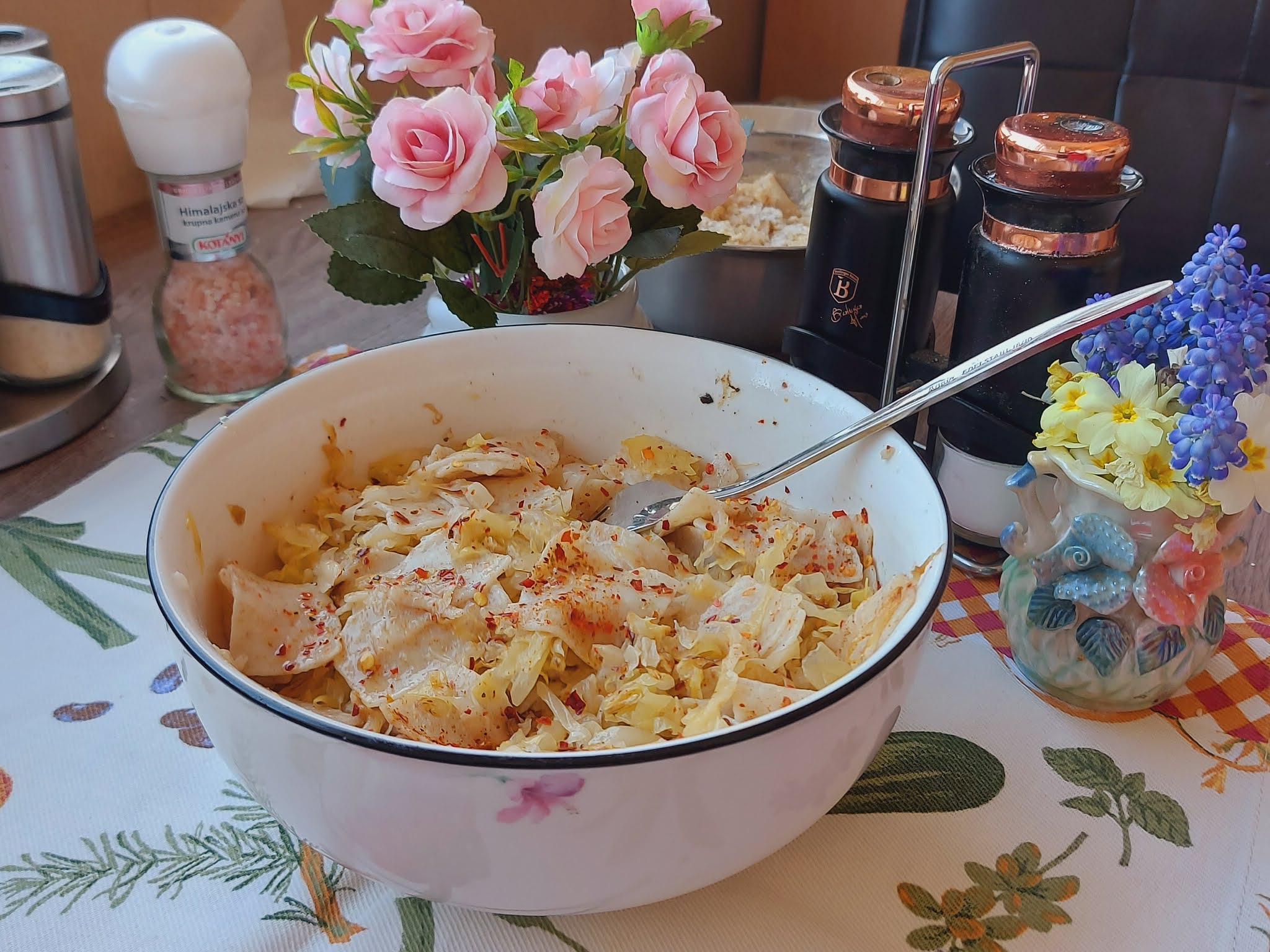 Dodati bibera pa izmešati sa kuvanim flekicama. Po želji dodati tucanu ljutu papriku .Vrhunsko obožavam…https://www.youtube.com/watch?v=T0TP6ybvt6c