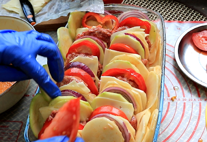 U podmazan pleh redjati povrće a izmedju faširane i kačkavalj. Još malo pouljiti. Peći na 200 stepeni C oko 50 min da lepo zarumeniz krompir predlažem finu bakinu supu link recept za supu.. Prijatno dragi moji…