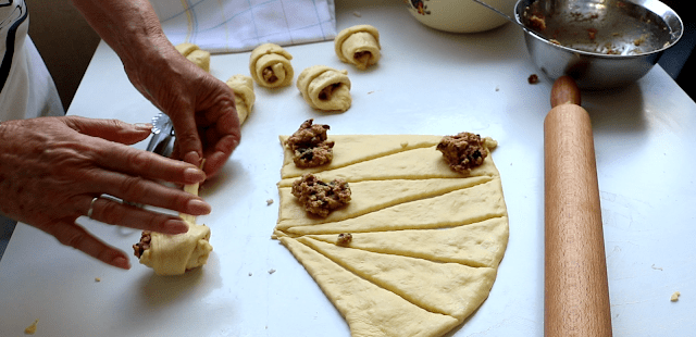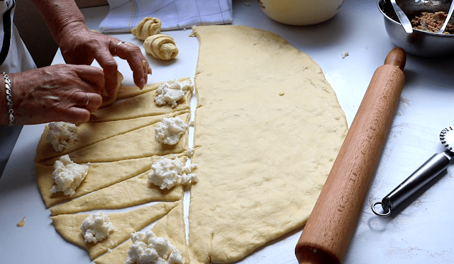 Pokriti da naraste pa ponovo premesiti. Istresti na sto testo pa ga istanjiti 1 sm debljine. Preseći na pola i seći trougliće