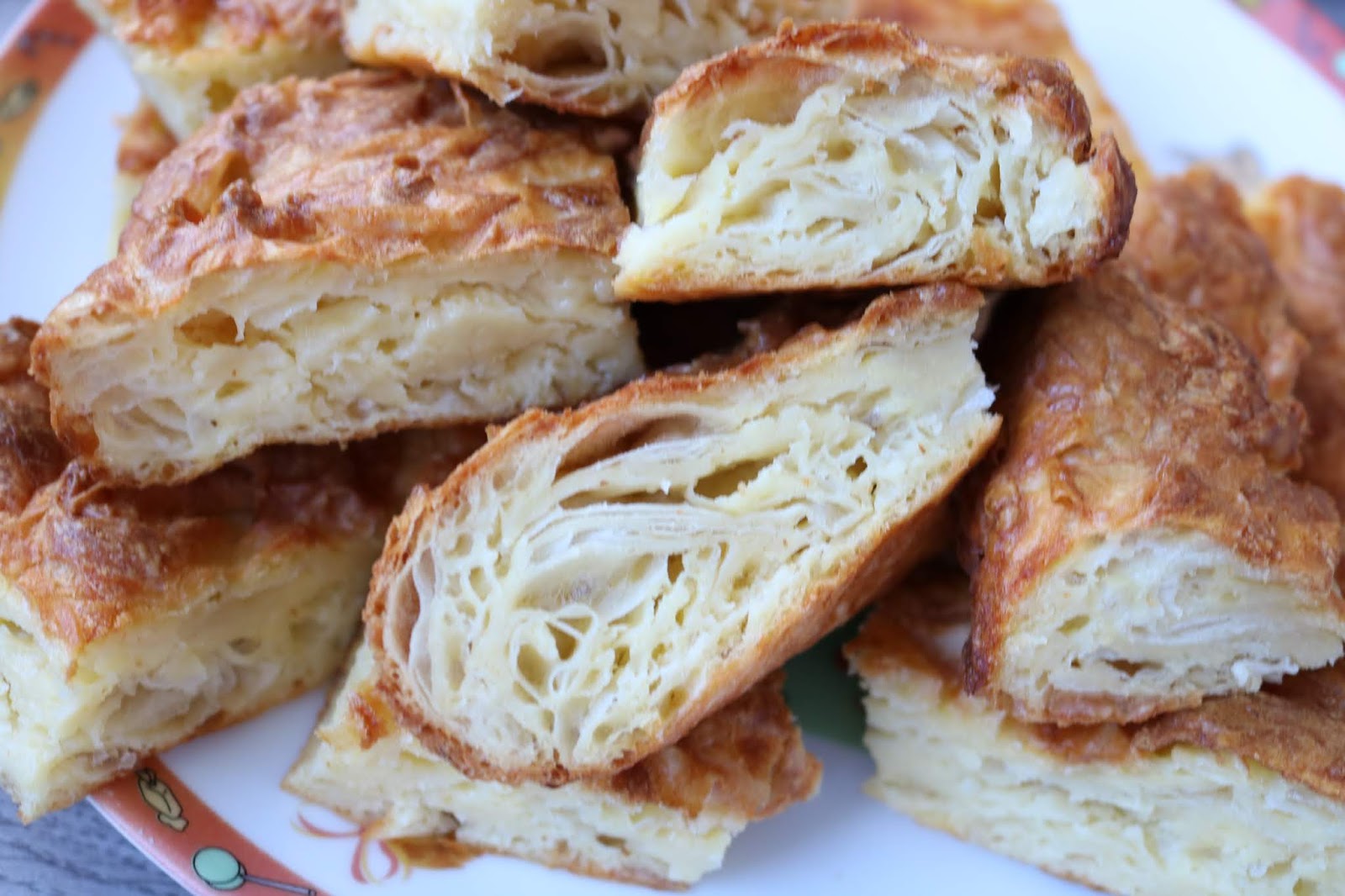 Kore za gibanicu rukama pocepati ili iseći makazama. Jaja umutiti pa dodati izdrobljen sir i jogurt kao i prašak za pecivo.