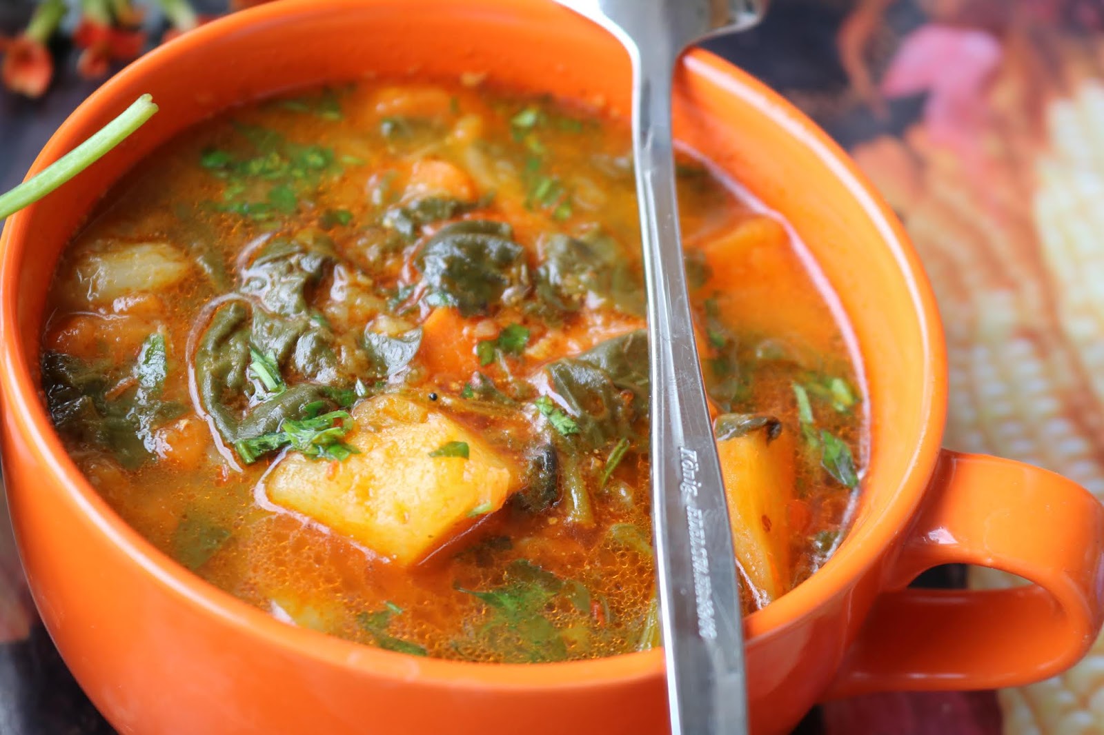 Dodati još povrća po želji i dinstati. Zatim dodati ajvar, alevu papriku, sečen na kocke krompir mleven paradajz i sečen na krupno spanać. Dodati i lovorov list. Kuvati na tihoj vatri oko 30 min.