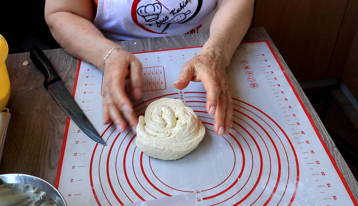 Prvu lopticu razviti oklagijom u pravougaonik i premazati malo margarino. Uviti u rolnicu i iseču po dužiti sa obe strane. Zatim to uvuti u krug kao puž.