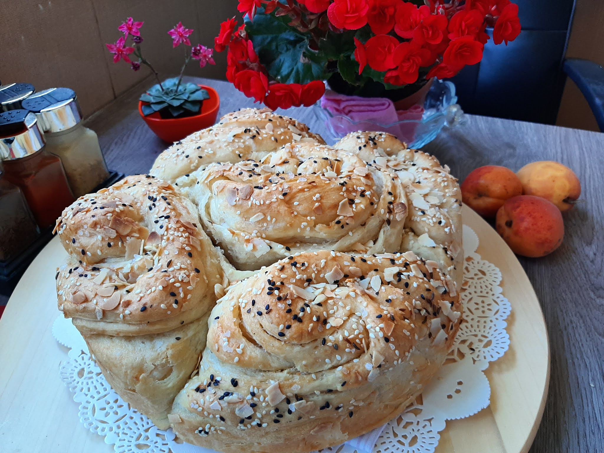 Ostale 4 loptice takoje tako i redjati u krug. pokriti da poraste pa premazati uljem i posuti semenkama kimom i krupnom solju. Peći na 180 stepeni C oko 50-45 min. da porumeni i pogača bude lagana….. prijatno..Original Article