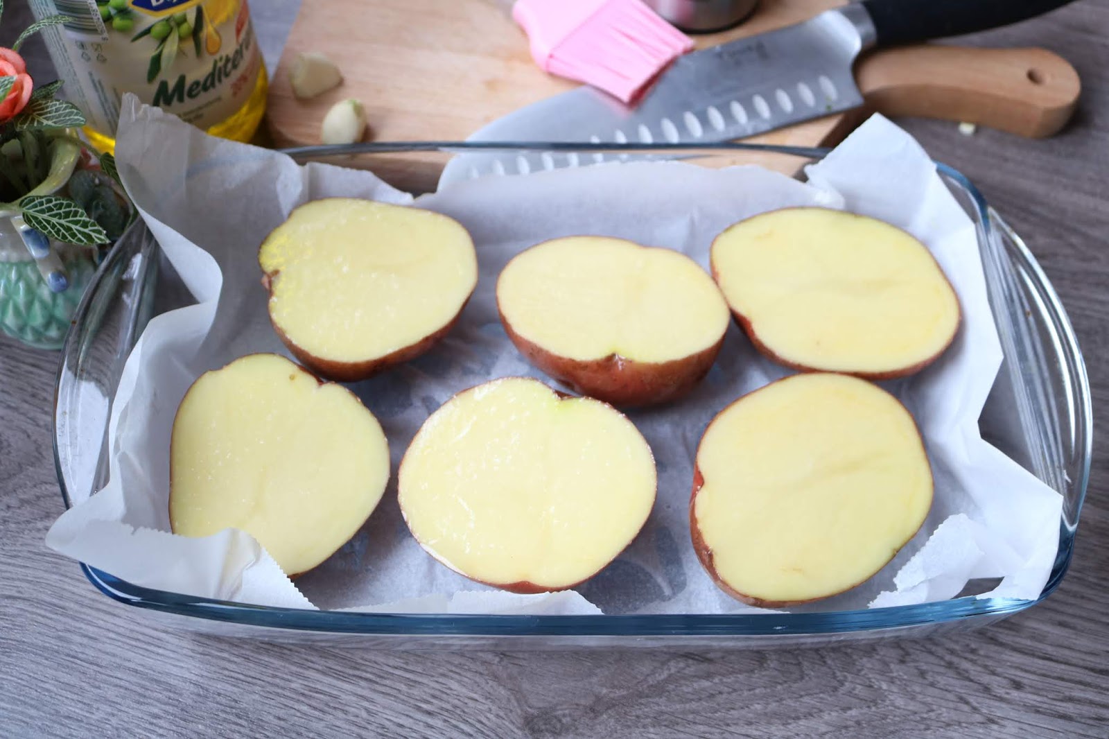 Lukom dobro istrljati svaku sečenu stranu krompira. Premazati uljem i posuti krupnom solju.