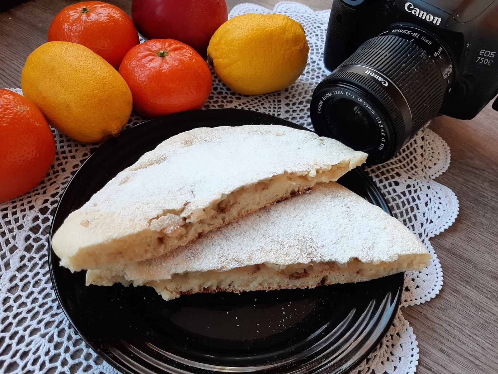 U sredunu testa staviti rendane jabuke oko 2 kašike i preko malo cimeta Ušuškati testo sa svih strana okrenuti i rukama razvuči opet veličine tanjira uz dodavanje brašna ako se lepi. Ostaviti opet da odmori 10 mi.