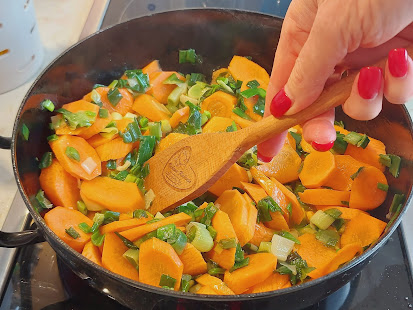 Kad se izdinstata ubaciti na kolutove šargarepu. Dodati malo vode i dinstati da omekne oko 20 min. Posloliti pobiberiti.. dodati peršunov list