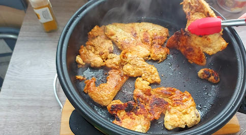 Meso iseći na šnicle pa ga izlupati posolit. Premazati sa senfom pobiberiti i posuti belim lukom i dodati 2 kašike soja sosa i maslinovog ulja malo i sve izjednačiti.