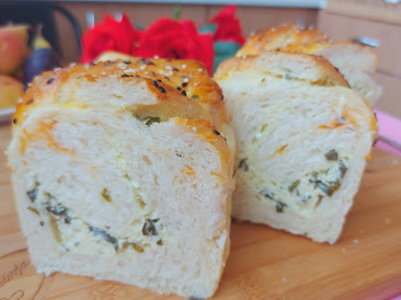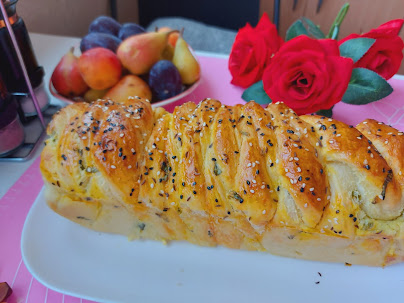 Prazni deo testa još malo razvući testo oklagijom i iseći ga na trake. U preostali sir dodati malo crvene paprike p premazati trake .Svaku traku uviti oko svoje ose. Donji deo testo uviti ka trakama formirajući rolnicu. Staviti u podmazan pleh i pokriti da odmori.