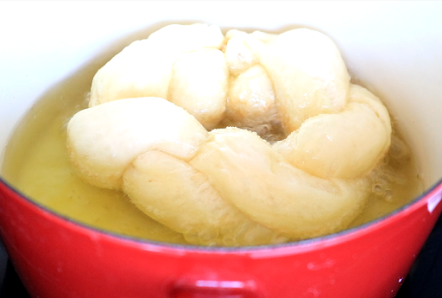 Ostaviti pokriveno na sobnog temperaturi 30 min. Istresti na podmazan sto sa uljem i razviti pravougaonik. Iseći na trake oko 1,5 cm. Svaku traku izvaljjati u valjak.