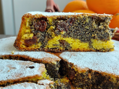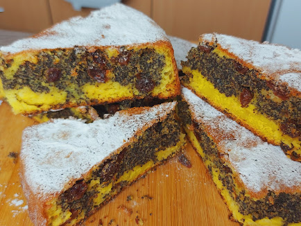 .U ostali deo testa dodati mleveni mak , zatim suvo groždje malo cimeta i izmešati lagano. Sipati na svetli deo u plehu i rasporediti kašikom.