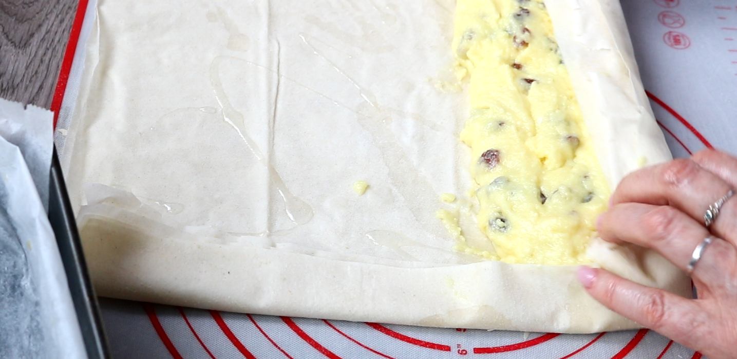 Na četvrtu pri dnu istresti sav griz saviti malo ivice i uviti i prebaciti u uzan pleh. Umutiti i drugo jaje dodati kašiku griza izjednačiti i premazati piru.