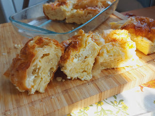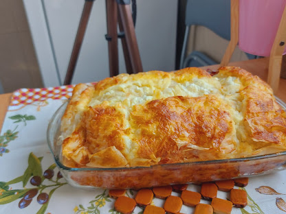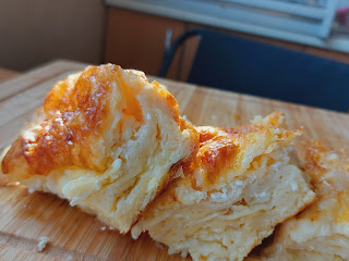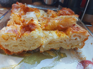 Tako i drugi red pa preko razbacati šaku čistog sira. Zatim treći red opet umoćiti kore pa gir..I tako dok imate kora i fila.